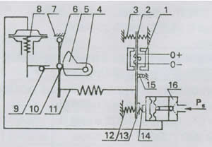 如图二所示当从电动调节器来的电流信号,输入到力矩马达组件的线圈(1)时,在力矩马达的气隙中产生一个磁场,它与永久磁铁产生的磁场共同作用,使衔铁(2)产生一个向左的力,主杠杆(衔铁)(2)绕支点(15)转动,挡板(13)靠近喷嘴(14),喷嘴背压经放大器(]6)放大后,送人薄膜执行机构气室(8),使阀杆向下移动,并带动反馈杆(9)绕支点(4)转动,连接在同一轴上的反馈凸轮(5)作逆时针方向转动,通过滚轮(10)使付杠杆(6)饶支点(7)转动,并将反馈弹簧(11)拉伸、弹簧(11)对主杠杆(2)的拉力与力矩马达作用在主杠杆上的力矩相等寸,杠杆系统达到平衡状态。此时,一定的信号电流就与一定的阀门位置相对应。弹簧(12)足作调整零位用的。以上作用方式为正作用,若要改变作用方式,只要将凸轮翻转,A向变成B向等,即可.